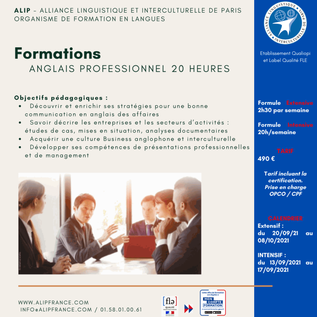L’école ALIP s’implique depuis plus de 15 ans dans la formation en langues et accompagne les salariés et DRH dans le développement de leurs compétences linguistiques professionnelles. ALIP est un organisme de formation Qualiopi.