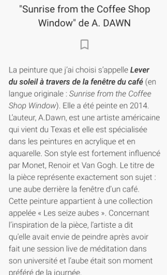 Les participants de l’atelier de culture ont donc créé, sous l’impulsion de leur professeure Eugénie, une petite exposition virtuelle pour remonter le moral de tous les Alipiens en cette période de confinement. Et le moins qu’on puisse dire, c’est qu’elle a remonté le moral à toute l’équipe !