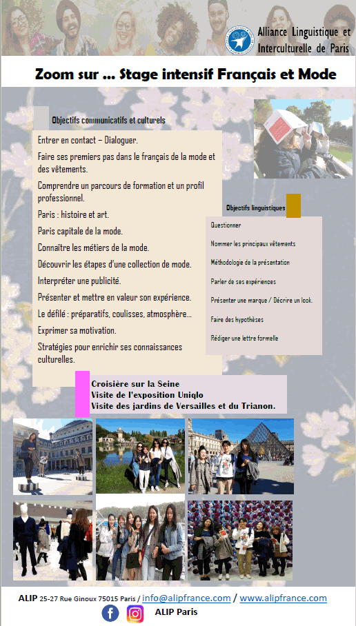 Ci-dessous un aperçu de notre programme de cours de français et mode, et quelques photos souvenirs !